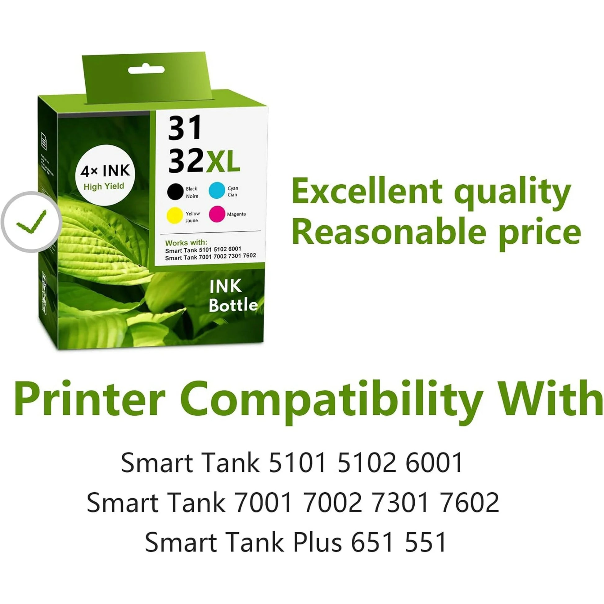 - 32XL/31 Ink Bottle to use with: Smart Tank 5101 5102 6001 7001 7002 7301 7602 Plus 651 551 Ink Tank Printer