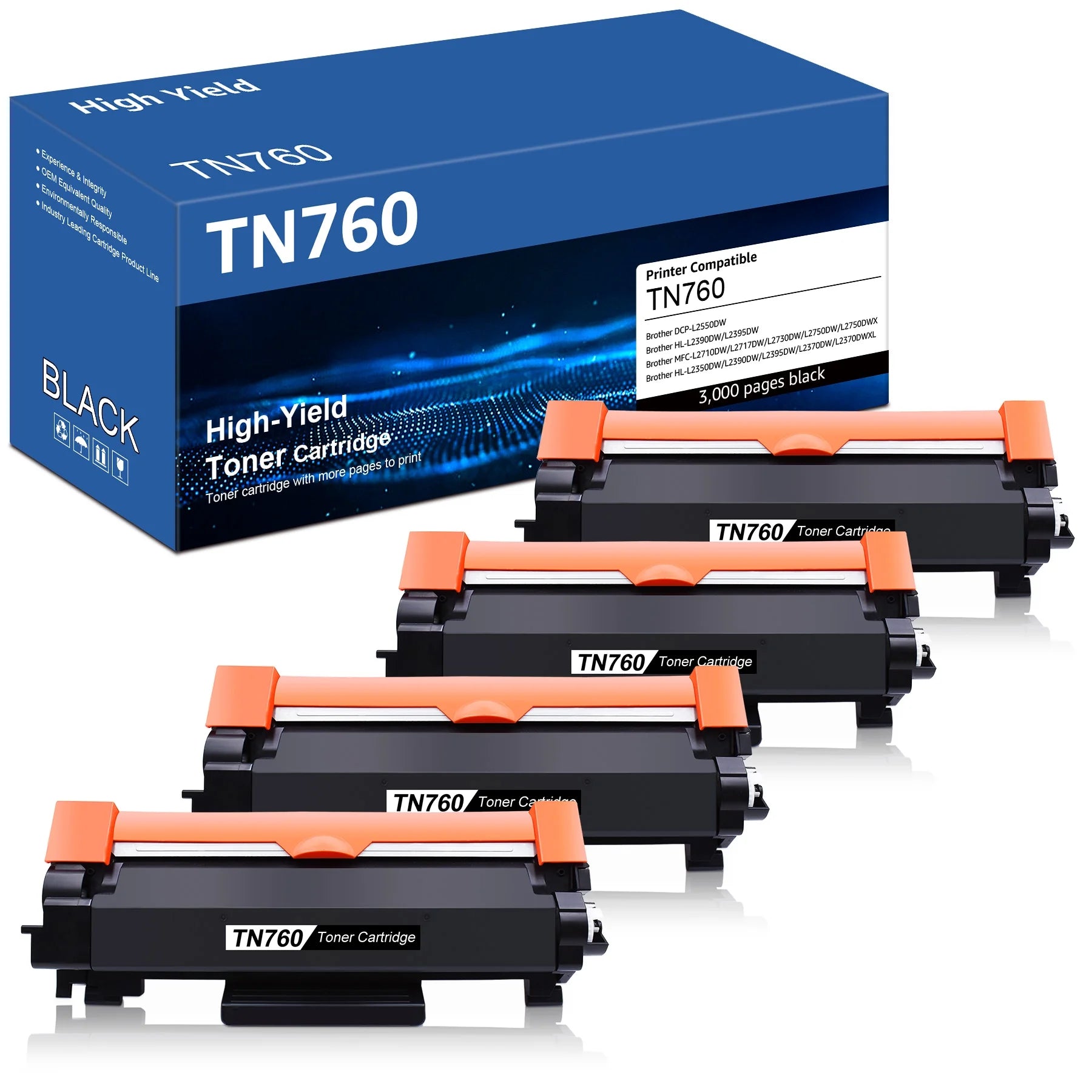 - Package Contents: Includes 1 User Guide and 4 TN760 Black toner cartridges.